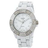 The "Boyfriend Rhinestone" watch by Golden Classic is a striking ceramic like watch.  This is a great watch for your everyday wardrobe.  The oversized, boyfriend inspired silver bezel is accented with clear rhinestones.  Marked on the bezel are silver minute/second marks, in 10 minute intervals.  The white dial with silver Arabic hour markers create a high contrast.  Combined with silver hour and minute hands, time is easy to read.  A three link white band holds tight to your wrist with a deployment clasp.  This all white watch with silver accents is a fashion accessory must have!
