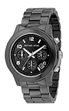Black ceramic case with a black ceramic bracelet. Black ceramic bezel. Black dial with luminous hands and alternating stick and Arabic numeral hour markers. Minute markers around the outer rim. Date displays between the 4 and 5 o'clock positions. Three - 60 seconds, 60 minutes and 24 hours. Quartz movement. Scratch resistant mineral crystal. Solid case back. Case diameter: 44 mm. Case thickness: 12 mm. Push button deployment clasp. Water resistant at 50 meters (165 feet). Functions: hours, minutes, seconds, date, chronograph. Michael Kors Black Dial Black Ceramic Bracelet Oversized Watch MK5164.